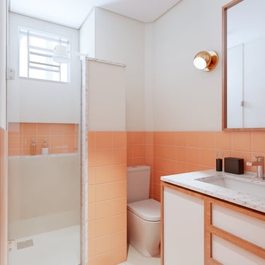 Nas áreas molhadas, o ladrilho hidráulico é novamente protagonista: no banheiro social, o revestimento colorido e o granito pitaya dialogam com a marcenaria original em madeira, conferindo personalidade e leveza ao ambiente.