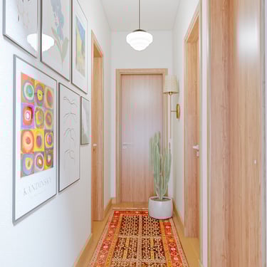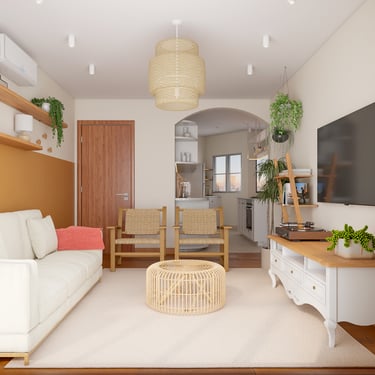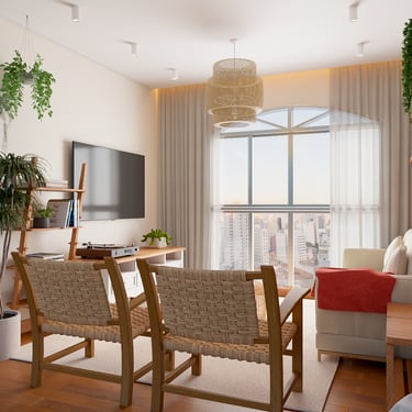 Cores, texturas e elementos decorativos — como arandelas em palha, quadros e pendentes retrô — completam a identidade visual do apartamento, que hoje é um lar cheio de charme, funcionalidade e autenticidade