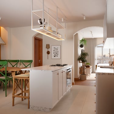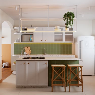 A principal referência do projeto está nas próprias esquadrias em arco, que inspiraram a integração entre sala e cozinha, marcada por uma ilha central funcional e acolhedora. A cozinha, agora ampliada, ganhou revestimentos em ladrilho hidráulico verde e granito pitaya, em composição com marcenaria branca e serralheria com vidro, criando uma atmosfera vibrante e aconchegante.