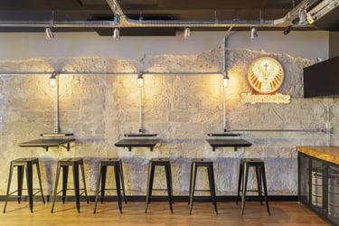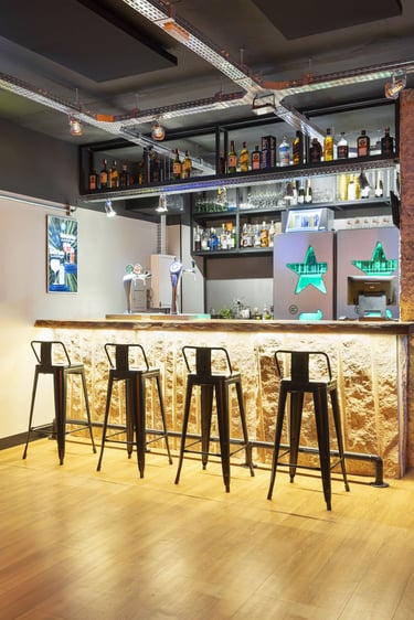 A escolha dos materiais e acabamentos foi essencial para traduzir a identidade do bar. Texturas brutas e tons escuros criam uma atmosfera intimista e contemporânea, em sintonia com a proposta da marca.